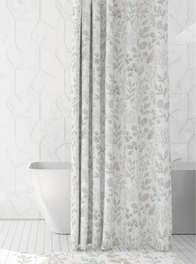 Presenta un estampado de hojas sobre fondo blanco, ideal para dar un toque natural y fresco al baño.