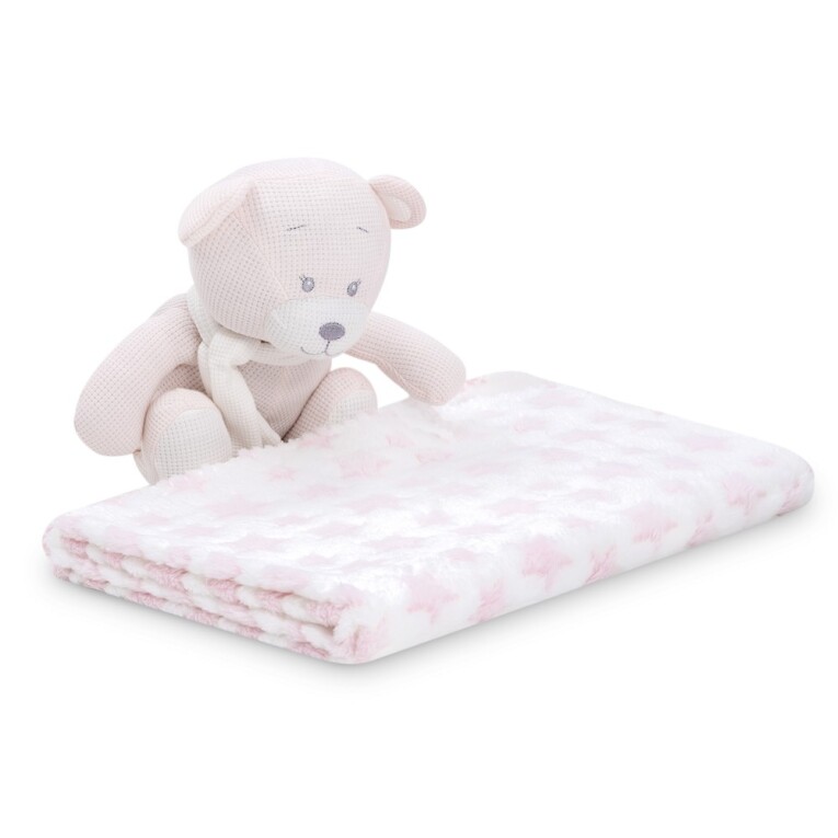 Suavidad y ternura: manta polar ultrasuave (80x110 cm) y osito de algodón de 29 cm.