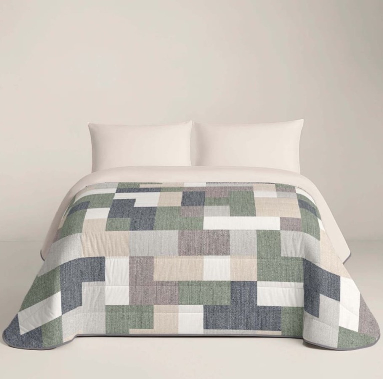 Su tejido exterior es una microfibra esmerilada de alta calidad, con un ligero brillo y textura aterciopelada que aporta elegancia y suavidad al tacto. El estampado digital geométrico, tipo patchwork moderno, presenta tonos neutros fáciles de combinar, manteniendo su intensidad y definición lavado tras lavado.