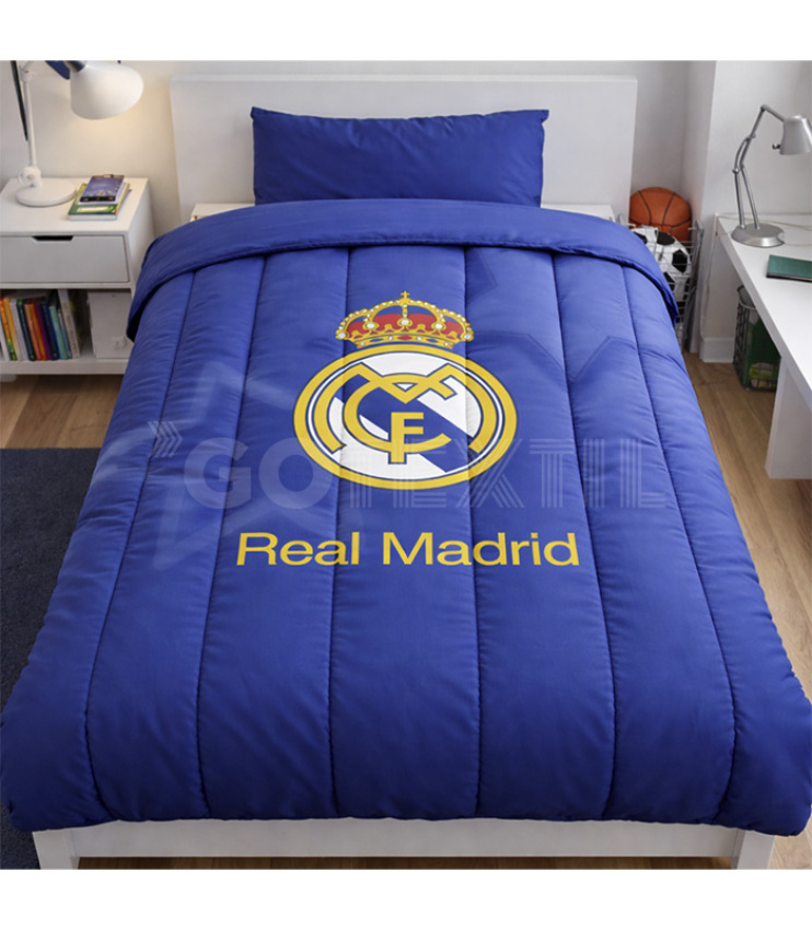 Este edredón Real Madrid cuenta con un estampado digital de alta definición que reproduce con gran nitidez el escudo oficial del club y su nombre en tonos dorados sobre un fondo azul navy. El resultado es un diseño clásico, moderno y equilibrado, ideal tanto para niños como para jóvenes aficionados que quieren mostrar su orgullo por el Real Madrid sin renunciar a un estilo cuidado.