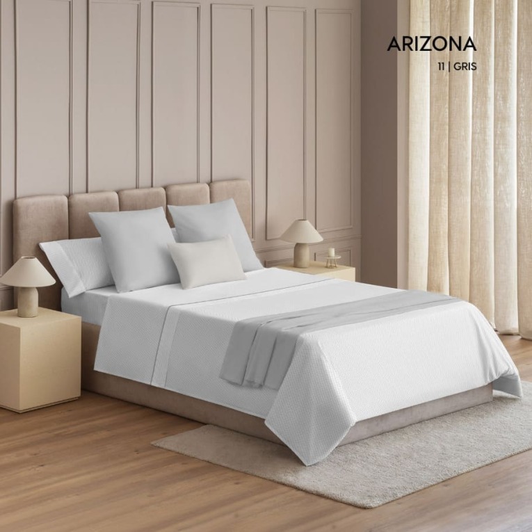 Su diseño moderno de pequeños rectángulos, combinado con una bajera estampada a rayas, añade un toque actual y elegante al dormitorio. Disponible en tres tonos neutros —lino, azul y gris—, se adapta fácilmente a cualquier estilo de decoración.