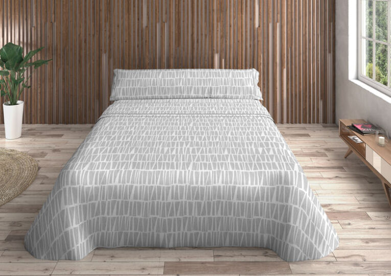 Este juego de sábanas de algodón destaca por su diseño minimalista en tonos gris y azul, una combinación versátil que encaja tanto en ambientes modernos como en decoraciones más neutras. Es uno de los modelos más demandados por clientes que buscan renovar su ropa de cama con un estilo actual sin renunciar al confort.