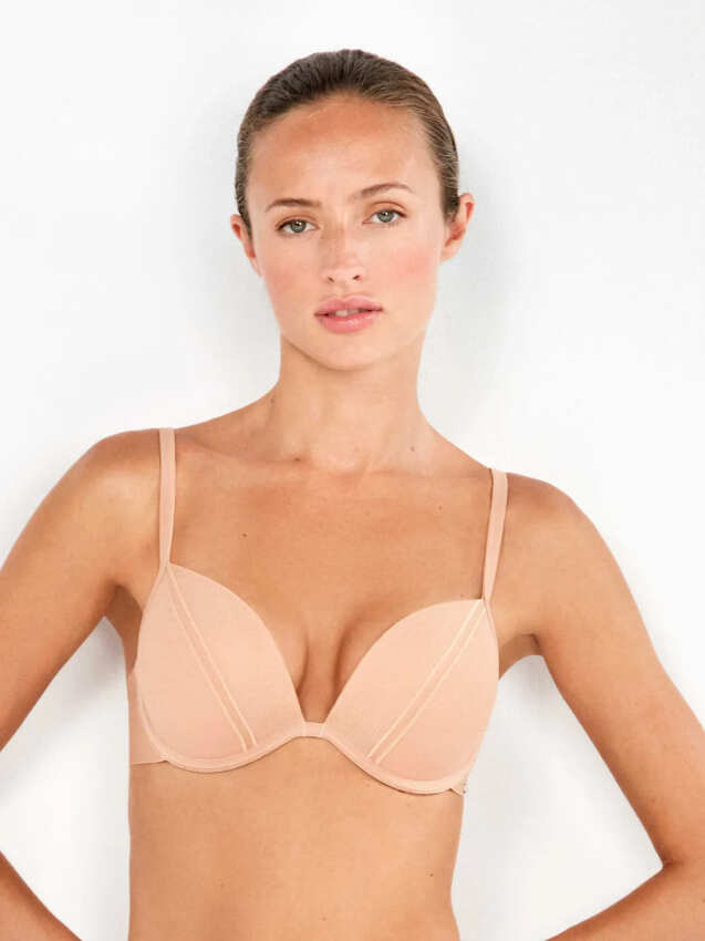 El sistema push up +2 eleva y aproxima el pecho. Proporciona mayor proyección frontal. El resultado es un escote definido y femenino bajo cualquier prenda.